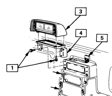 | If equipped, remove auxiliary gauge cluster (3) by removing the four 7mm bolts (1) that attach it to the dashboard. Disconnect the connector (5) at the gauge. It is not necessary to remove the trim plate. Important: Disconnect auxiliary gauge cluster connector near radio as well; both connector ends must be loose! Wiggle on the cable to find the other end. If both ends are loose, you can just leave this cable in the dash instead of fiddling it through the small hole in the top. You'd never get it back in there anyway. |