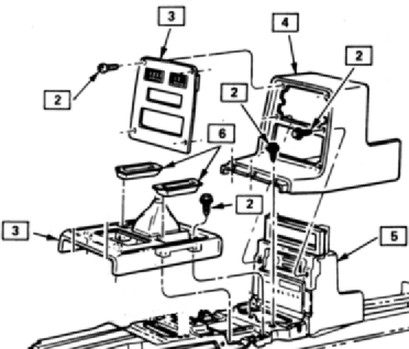 | First, begin by removing the shift knob. On manual transmission Fieros, just unscrew the knob counterclockwise, on automatic Fieros, you need to remove a U-shaped clip with a screwdriver. Next, remove shifter console (3) by removing the four 7mm bolts under the ashtrays (6). On automatic Fieros, untwist the shift dial lamp socket as well. Now, remove the radio surround console (4) by carefully removing the four torx screws for the radio surround trim plate, then two bolts between radio and heater controls, and three more at the forward bottom part. |