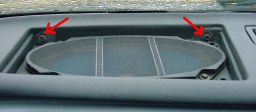 | Pop up the speaker covers with a flat screwdriver. Be extra careful not to damage your brittle dashboard! Remove the speakers, if they're still stock, there will be four 7mm bolts each, and the connector has a small latch, don't break it. Remove the four long 7mm bolts in the speaker cavities, two on each side (red arrows in the picture to the right). |